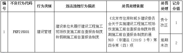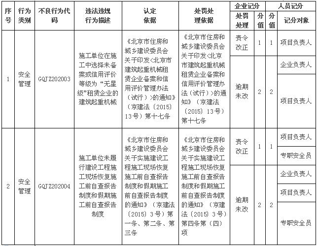 市住房城乡建设委2015年分别印发了规范性文件《关于实施建设工程施工现场恢复施工前自查报告制度和假期施工前自查报告制度的通知》(京建法〔2015〕3号)和《关于印发<北京市建筑起重机械租赁企业备案和信用评价管理办法(试行)>的通知》(京建法〔2015〕13号),对参建单位的违法违规行为,要依法予以记分处理。
